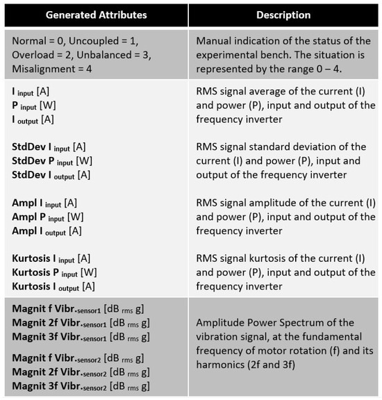 The collected signals and generated attributes for the samples of each scenario comprised the dataset built by us that was utilized to simulate several anomaly types. They are described in Figure 15. Figure 16 presents a brief explanation of each generated attribute.