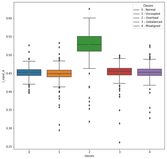 Box plots were generated for a better understanding of the relevance of the attributes of the remaining electrical quantities. In Figure 20, it is possible to observe the behavior of the attribute I_input_A in relation to the operating conditions of the machine, that is, in relation to the classes (scenarios). Note the clear relevance of this attribute in identifying class 2 (overload), with a significant difference in the mean, median, and interval values between the quartiles in relation to the other classes. In this way, the attribute I_input_A was considered relevant.