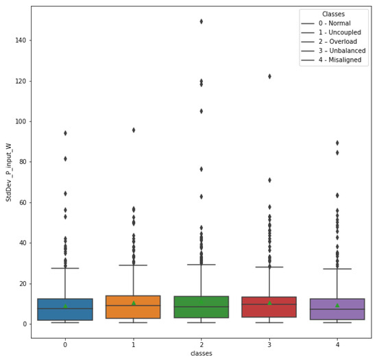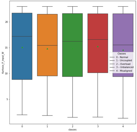 The box plot of the Kurtosis_P_input_W attribute shows a certain variation of measures in relation to the different classes, mainly in the average measure. As this attribute would require an additional input power sensor in the frequency inverter, it was decided to exclude it. This reduces the number of electrical magnitude sensors needed, contributing again to the viability and cost-effectiveness of the anomaly detection system.