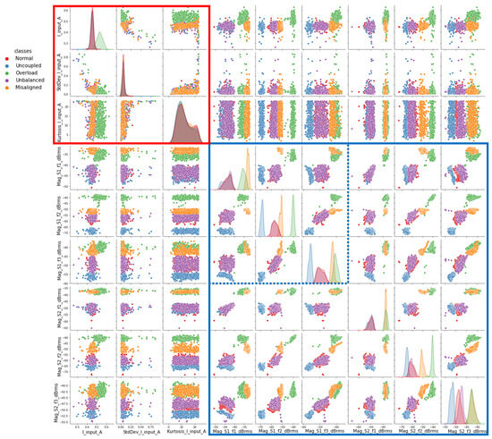 It was decided to evaluate the behavior of the classes using the previously selected electrical magnitude attributes first, then append the vibration attributes. To this end, a pair plot matrix was generated, as shown in Figure 24.