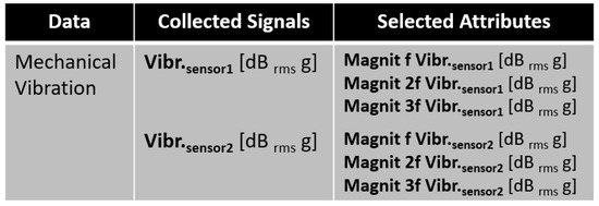 Then, it was concluded that by considering only the vibration attributes, it would be possible to distinguish all classes. After these correlation evaluations, the attributes shown in Figure 25 were retained for use in the models. Thus, from the 18 attributes generated by the five sensors, 6 attributes generated by two sensors were selected.