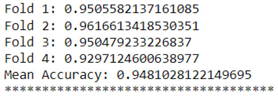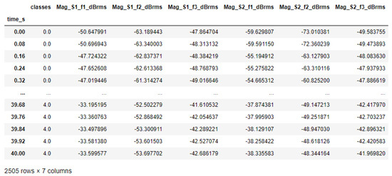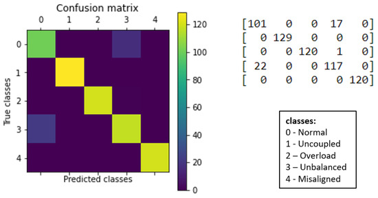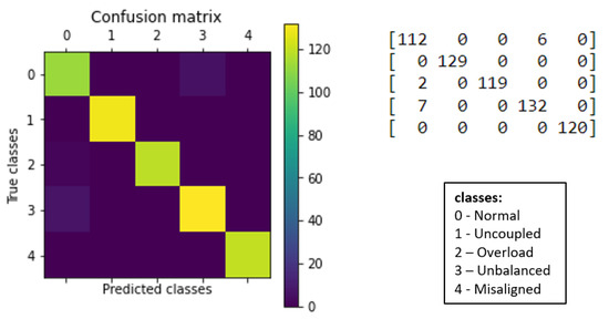 The training was supervised, with balanced samples of five classes (target attributes) representing the possible situations in industrial applications driven by electric motors for rotating machines. The possible situations are identified by the “classes” attribute, with numerical values ranging from 0 to 4 (see Table 1).