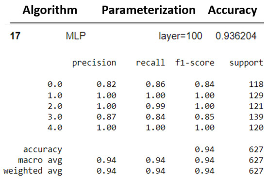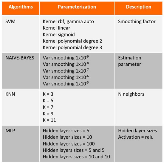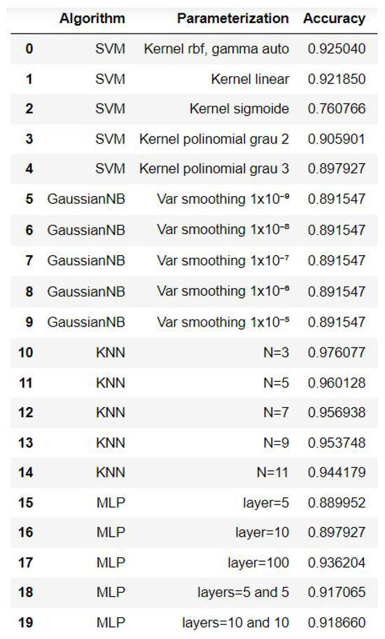 About 501 samples were generated for each of the five classes, totaling 2505 samples. For all trained algorithms, a cross-validation technique was adopted, dividing the samples into 75% for training (1878 samples) and 25% for testing (627 samples). Figure 27 presents the trained algorithms along with their respective parameterizations.