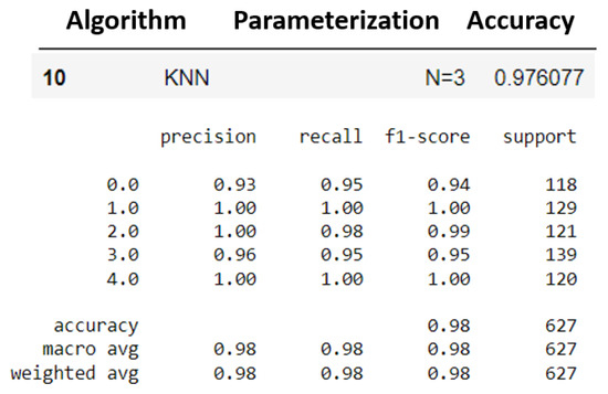 The k-NN model (K = 3) had a higher accuracy average than the MLP model (layers = 100) (see Figure 29 and Figure 30). Furthermore, when observing the confusion matrix for the k-NN model (K = 3) (see Figure 33), it can be seen that in a test set composed of 627 samples, the model was able to detect anomalies in the vast majority of cases. In the k-NN model (K = 3), there were only nine errors in anomaly detection: two errors in detecting the ‘overload’ anomaly and seven errors in detecting the ‘unbalanced’ anomaly. In contrast, the MLP model (layers = 100) exhibited 22 errors in anomaly detection, all of which were related to ‘unbalanced’ anomalies. The classifications of interest are those referring to the detection of anomalies, that is, the classifications of classes 1 to 4 since class 0 represents a normal situation of operation. Thus, we can consider that the best algorithm was the k-NN model (K = 3).