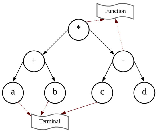 Genetic algorithms (GAs) and genetic programming (GP) both operate on the principle of propagating generations of individuals by selection based on the “survival of the fitness” criterion. The individuals that are part of a generation are initially generated in a random way, and each one is evaluated and ranked using a fitness function related to the process goal. An individual in a GA corresponds to a set of values in a parameterized model to be optimized. In contrast, an individual in GP is a tree-based structure. As depicted in Figure 1, each tree is a combination of several nodes and branches. Usually, variables and numerical constants are located at the leaf nodes of the tree, known as terminals, while mathematical operators, which are located in the interior nodes, compute the values of nodes and leaves attached under it, commonly referred to as functions. Terminals are selected from a "terminals set", , and functions are selected from a "functions set", .