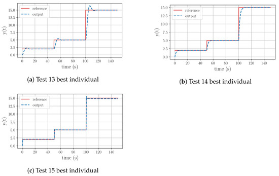 When checking the final equation of Test 13, it can be seen that the equation corresponds to a PI structure. It is worth noting that this equation was found in generation 30. Figure 7a depicts how the tracking action of the controller draws an overshoot peak during its operation. In the case of Test 14, the equation has the best performance of the group. It presents a PI structure where the proportional part is based on the current value of state 1. Figure 7b shows how the tracking action is fast but not aggressive, has no overshoot peak, and has minimal steady-state error. Finally, the equation of Test 15 describes a PI form. The proportional part is based on the error and both of the system’s states, while its integral component is the result of a division of time by the weighted integral of the error with the addition of the system’s state 1. In Figure 7c, it can be seen that this equation has the most aggressive behavior of the group. However, its overshoot peak is minimal.