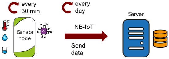 The first block belongs to the sensor nodes deployed in the crop, which send sensor data via the NB-IoT network to the server. The data are sent every day unless a certain type of risk has been detected.