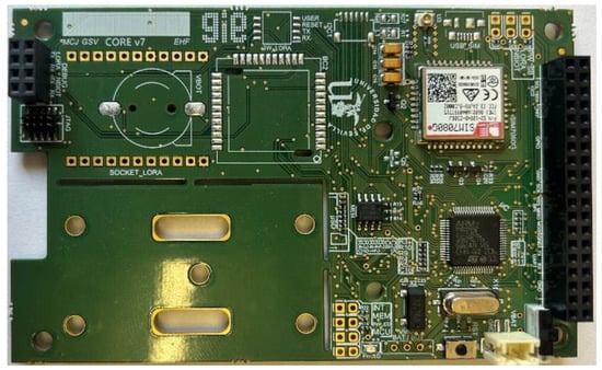 A SIM7080 NB-IoT transceiver (SIMCOM manufacturer), used to send the collected data to the server. It communicates with the microprocessor based on AT commands and a standby power consumption of 3 µA.