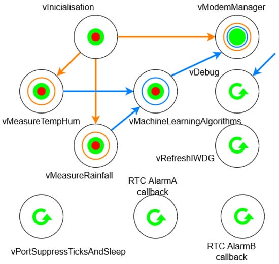 Figure 8), where blue arrows represent queues and orange ones, RTOS semaphores, can be described as follows: