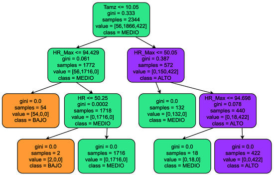 Decision tree for disease risk evaluation. Tamb = ambient temperature, HR = relative humidity and HR_Max = relative maximum humidity in the last 24 h. The algorithm outputs an assessment of risk, i.e., BAJO (low), MEDIO (medium) and ALTO (high).