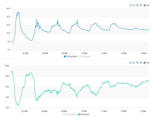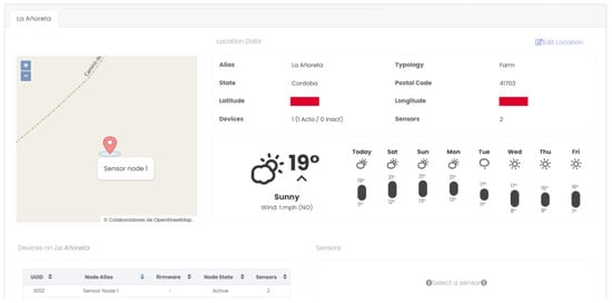 Figure 2): Sensor nodes collect temperature, humidity, and rainfall data every 30 min. This information is stored in their memory. Every day, these data are sent to the server. Sending data every day was chosen as a compromise between the requirement for immediacy whilst minimizing power consumption, thus increasing battery life. A daily transmission frequency is adequate to monitor crops. If for some reason the sensor node detects a problematic situation, it would immediately send all the stored data information with an appropriate warning, as can be seen in the ‘risk assessment and notification’ functionality.