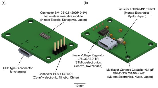 Also, the main components of the wearable module include: two 20 position receptacle connectors, BM10NB(0.8)-20DS-0.4V(51) (Hirose Electric, Kanagawa, Japan); a ceramic antenna, 2450AT18A100E (Johanson Technology, Camarillo, CA, USA); a lithium-ion and lithium-polymer battery charge controller, MCP73812T-420I/OT (Microchip Technology Inc., Chandler, AZ, USA); a low voltage drop fixed stabilizer, MCP1700-3002E/TO (Microchip Technology Inc., Chandler, AZ, USA); a voltage regulator, TLV70033_SOT23-5 (Texas Instruments, Dallas, TX, USA); a Hall sensor, KTH1601SL-ST3 (CONNTEK Microelectronics Technology, Quanzhou, China); an LED, KPHHS-1005SECK (Kingbright, Shanghai, China); and a 32 MHz quartz resonator, NX2520SA (NDK, Tokyo, Japan).
