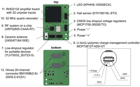 The wireless wearable module is based on the NRF52805-CAAA-R7 (Nordic Semiconductor, Trondheim, Norway) receiver–transmitter microprocessor and the RHD2132 32-channel unipolar input amplifier chip (Intan Technologies, Los Angeles, CA, USA). The RHD2132 chip enables the in vivo recording of weak electrical signals by directly converting them into a digital data stream, replacing traditional analog instrumentation and digitization circuitry found in typical electrophysiological recording systems. The differential gain exhibited by the RHD2132 chip is 192 V/V.