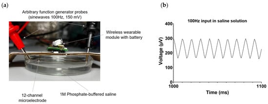 The performance of the wireless electrophysiological system was initially assessed in vitro using phosphate-buffered saline (PBS). To achieve this, a 12-channel microelectrode connected to the wireless module was immersed in PBS, as depicted in