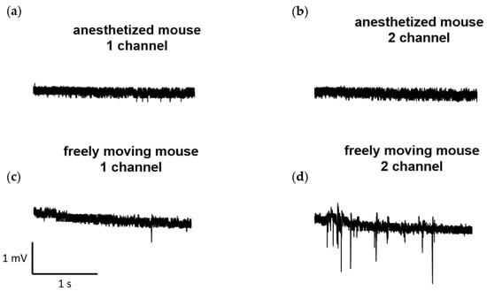 Figure 5a) was manufactured and surgically implanted into the mouse brain. The in vivo recording took place within a Faraday cage to minimize interference and noise. Two channels were recorded at a sampling rate of 1000 Hz. The obtained results are presented in