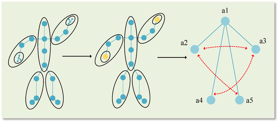 Next, using the given skeleton sequence X, we construct a coarse-grained proportion map. The human skeleton is divided into five parts: the central torso, the left arm, the right arm, the left leg, and the right leg. Each of these parts is processed separately. Typically, the most common method is to calculate the centroid of each region to represent its approximate location. However, this method can be flawed for non-convex shapes, such as a bent arm. A protrusion at the elbow, or any indentations, might lead to offsetting the centroid coordinates, thereby failing to accurately depict the features of that part. Consequently, this study adopts the mean coordinate method, which is applicable to various non-convex shapes present in skeleton data, thereby preserving more detailed information. The positions of the skeleton points included in each part are processed by calculating the mean coordinates, which are then merged into new skeleton points. This is referred to as the coarse-grained proportion map. Figure 5 illustrates the graph structure constructed corresponding to the coarse-grained proportion map.
