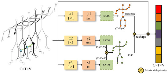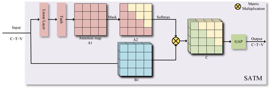 Specifically, the Self-Attention Temporal Module (SATM) takes a skeleton sequence with dimensions as input. Initially, the input goes through a linear transformation layer and is then plugged into the Tanh nonlinear mapping function, obtaining the attention distribution at different time points with dimensions . Next, this attention distribution is replicated T times to yield the attention distribution matrix A1 with dimensions , as depicted in Figure 9.