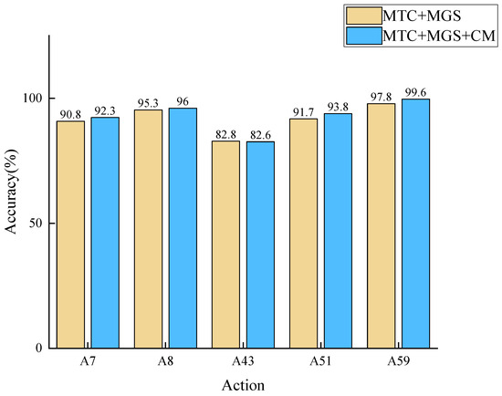 Furthermore, this paper individually verifies the benefits that the CM module brings for specific actions. As illustrated in Figure 10, five different types of actions are tested on the joint stream of NTU-RGB+D 60. Except for A43, all other actions have shown improvement (A7.throw, A8.sitting down, A43.falling, A51.kicking other person, A59.walking towards each other). The accuracy decline for A43 might be due to it not being a contralateral or ipsilateral coordination movement. In conclusion, the coordination module is capable of effectively extracting human motion coordination features, which can be more evidently demonstrated in some specific actions.