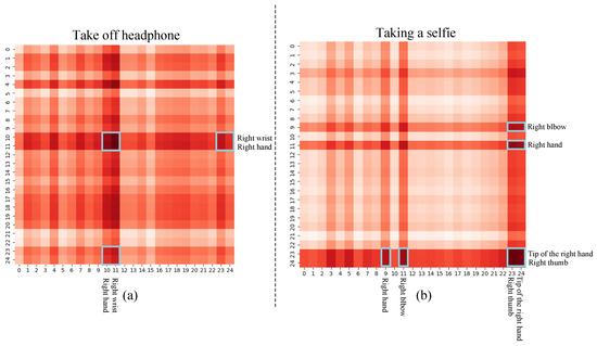 Visualization of the connection strength of two action examples. (a) Indicates the action “Take off headphone“. The parts enclosed by blue boxes are represented as Right wrist and Right hand to indicate that this action has a more important role in this part. (b) Indicates the action “Taking a selfie”. The parts enclosed by blue boxes are represented as Right bebow, Right hand, Tip of the right hand and Right thumb to indicate that the action has a more important role in this part. It is observed that our model can adaptively focus on joints that are highly relevant to actions without relying on prior physics knowledge.