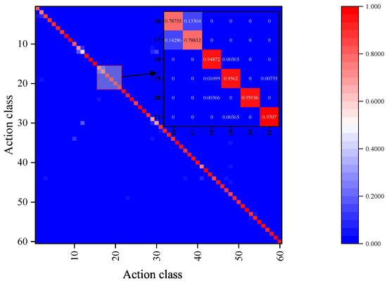 As illustrated in Figure 14, the experimental results of the NTU-RGB+D 60 dataset using the xsub protocol were analyzed using a confusion matrix. It is apparent that the proposed model performs well for most actions, with the exception of action A12. writing, having an accuracy below 60%. Conversely, the actions A28. make a phone call/answer phone and A30. typing on a keyboard have an accuracy rate below 70%. However, only subtle differences exist in the hand movements among these three action categories. According to the confusion matrix, not only are similar actions likely to be confused, such as A12. writing and A30. typing on a keyboard, but actions with the same trajectory and those in the opposite direction, such as A16. wear a shoe and A17. take off a shoe, are also susceptible to confusion. This indicates that the model described in this paper is not yet sensitive enough to the temporal sequence of actions.