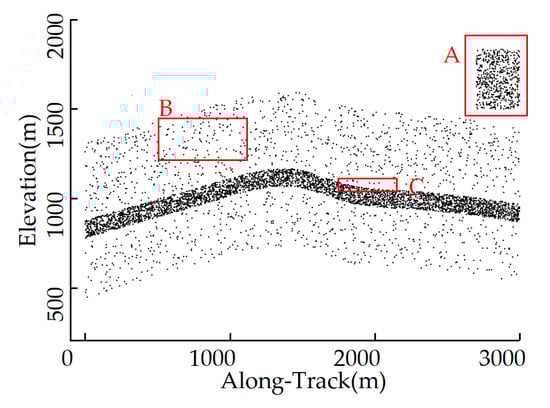 ATL03 provides an initial classification of photons as signal [] or background. Additionally, ATL08 also provides classification labels, and the photons in ATL03 can be easily reversed and indexed using the identified parameters [,,]. For more information, see Table A1 in Appendix A. However, they are not accurate enough to serve as references for complex topographies such as hilly and mountainous terrains. Some existing approaches for quantitative denoising output assessment typically rely on the manual interpretation of Google Earth satellite images to construct validation datasets [,]. In this sense, these subjectively labeled references may be imprecise. For this reason, we employed the airborne point cloud with high density as the reference data to evaluate the signal extraction algorithm presented in this work [], which provides an increasingly objective benchmark to quantify denoising accuracy. For supplementary validation, the digital terrain model (DTM) and digital surface model (DSM) with a horizontal resolution of 1 m from the airborne LiDAR data of approximately 10 pts/m2 were used to serve as boundaries for the signal photons. A photon is labeled as a signal when its elevation is within the DTM and DSM, and considered as noise when surpassing the threshold. Using airborne data as a constraint reduces subjectivity compared to manual classification, promising robust characterization over vegetation coverage areas.
