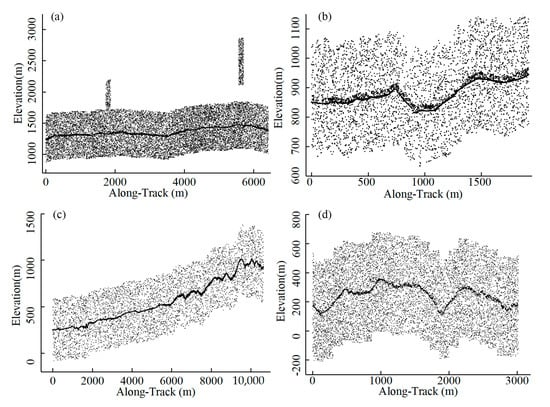 The ATL03 photons and ATL08 product used for this study are accessible from the National Snow and Ice Data Center (https://nsidc.org/data/icesat-2/data, accessed on 4 March 2023), including information such as the signal confidence, elevation, latitude, and longitude. Considering the impacts of slope and vegetation coverage factors on denoising, this study opted to test two representative vegetation coverage study areas []. The profiles of the raw data selected are shown in Figure 2, and the details are displayed in Table 1. One study area is located in the vegetation coverage region near the southern foothills of the Changbai Mountain in Baishan City, Jilin Province, China. This area is characterized by medium to high and uneven vegetation. The other experimental region is situated in the Taranaki region of New Zealand, with relatively sparse vegetation and complex terrains. In this area, we selected two ATL03 strips with a total length of approximately 13 km. Figure 2c represents a strip extending from the mountain foot to the summit, covering gentle slopes, mountain peaks, and abrupt terrain changes. Figure 2d depicts a mountainous area with steep terrain and rapid changes in the slope. These two study areas exhibit obvious slope variations, uneven vegetation coverage distribution, and different background noise patterns. These factors collectively challenge the algorithm’s robustness and the precision of noise reduction [].