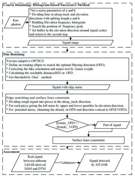 As shown in the flowchart presented in Figure 3, different types of noise were removed using a coarse-to-fine strategy. First, the histogram-based successive denoising as a coarse denoising process was applied to remove distant noise and part of the sparse noise, reducing the computation in subsequent steps and increasing the fault tolerance in further denoising it to the maximum. Secondly, based on the coarse denoising result, fitted approximate terrain curves serve as an aid to the adaptive rotated ellipse to find the OFD. Then, the OPTICS algorithm was applied in the OFD to remove the residual sparse noise. Next, according to the directional distribution of local densities of the internal signal and edge noise in residual photon clusters, the OFD and the direction vertical to optimal filtering direction (VOFD) ellipses were used as search domains to characterize this distributional difference. As a result, the edge noise was removed well during the fine denoising process. In addition, surface lines were fitted to further preserve the signals between them. At last, the results were evaluated using the reference data from airborne LiDAR.