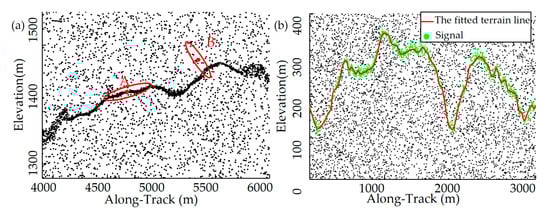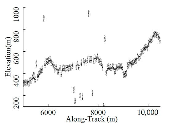 After a histogram-based successive coarse denoising, the signal centers along the trajectory were obtained. As shown in Figure 5b, a curve that roughly depicts the topography of this region was produced after sampling and fitting these signal centers. For photons detected in false directions, the wrong direction will be replaced by the tangent direction of the corresponding curve at the along-track distance during neighborhood search.