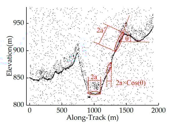 In addition, to ensure the consistency of the search ellipse in the along-track direction, the ellipse size needs to be modified based on the slope angle during the neighborhood search, considering that during the ground detection of ATLAS photons, the sensor collects point clouds over sloped and flat terrains with consistent firing and sampling rates. As shown in Figure 6, when the search direction exhibits an oblique angle to the ground, the along-track coverage of the ellipse will be shortened when using a fixed-size filtering kernel. Consequently, in sloped regions, a fixed search domain will therefore cover fewer pulses, thereby underestimating the photon density and influencing the denoising performance. Thus, the major axis of the search ellipse in sloped regions can be corrected by Equation (6), where a′ is the major axis over the flat terrain, θ denotes the angle between the search and horizontal directions, and a′ represents the major axis over the sloped terrain.