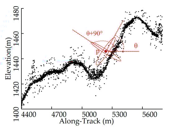where and represent the along-track distance and the elevation between the two photons; a and b are the lengths of the major and minor axes of the search ellipse. When distance , photon q is considered within the search ellipse centered at photon p; otherwise, photon q is outside the search ellipse. In areas of terrain relief, the search ellipse needs to be rotated to adapt to changes in the surfaces. In this case, the along-track and vertical distances are projected onto the major and minor axis directions of the rotated ellipse. The conversion method of and is illustrated in Equation (2), where θ is the counterclockwise angle between the major axis and the along-track direction.