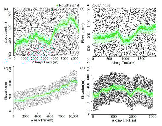 Spaceborne LiDAR has been widely used in global forest canopy height estimation [,,] due to its rapid and cost-effective detection of surface typography and vertical forest structure [,,,]. The accuracy of global forest height data evaluated by the Geoscience Laser Altimeter System (GLAS) onboard the Ice, Cloud, and Land Elevation Satellite (ICESat) has been proven over the past few decades []. However, limitations such as a large footprint size (70 m) and low sampling density (along-track spacing of 170 m) restrict its application in complex terrains []. To address these issues, the ICESat-2, equipped with the advanced topographic laser altimeter system (ATLAS) [], was launched and put into operation in September 2018. In contrast to the full waveform LiDAR system from the GLAS, ATLAS is a photon-counting LiDAR that utilizes high-frequency pulses [] with an emission energy of 160/40 μj at 10 kHz and 0.7 m along-track resolution for precise surface measurements [,], providing a high sampling rate, a small footprint size (10 m), and a nearly continuous along-track strip of point cloud data []. However, the original data from ATLAS, particularly the daytime data, are heavily contaminated by background noise arising from solar radiation and dark current returns [] and feature a random and wide distribution. In vegetation coverage areas, the abundant noise distributed adjacent to the canopy and the ground surface poses significant challenges for identifying the canopy and ground signals in photon-counting LiDAR data. In this sense, signal photon discrimination from the original data is necessary to address these challenges.