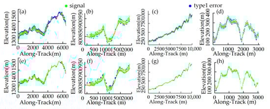 For better qualitative assessment, type 1 error and type 2 error indicators are used to qualitatively evaluate the performance of different algorithms []. The type 1 error is used to indicate when noise photons are misclassified as signal photons, and the type 2 error indicator is used to indicate when signal photons are misclassified as noise photons.