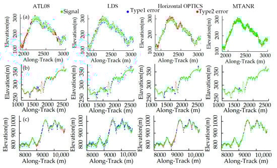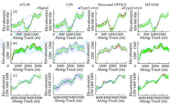 To better evaluate the performance of our algorithm, raw photons were also processed by ATL08, LDS, and the horizontal ellipse-based OPTICS [] on the selected datasets. Figure 10 depicts the details of point clouds in Baishan based on different methods. In three typical situations, ATL08 and the MTANR demonstrate good denoising outputs, removing most of the noise photons while maximally retaining the signal photons. Although most signal photons are preserved through LDS, this method fails to identify the edge noise (e.g., type 1 error in Figure 10). The horizontal OPTICS is less affected by edge noise than the LDS. However, lots of sparse signal photons under the canopy (e.g., type 2 error in Figure 10a,b) are misidentified as noise, causing discontinuities in the ground surface. Apparently, these errors will greatly influence the extracted canopy height and DEM in this situation.