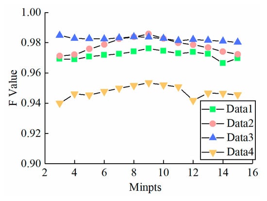 To explore how the parameter MinPts affects MTANR’s performance, a series of MinPts were set in each dataset, and the F value in every input parameter is shown in Figure 12. As depicted in Figure 12, with the MinPts increasing from 3 to 15 at a step length of 1, it remains at an overall high level, although it fluctuates a little. For OPTICS-derived algorithms, though the CD values and RD values of photons may vary with different parameters, they change at roughly similar magnitudes, so there is no apparent variation in the order of photons in the RD list []. Therefore, the denoising results perform stably under different conditions.
