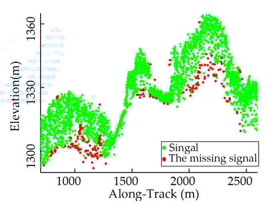 From the experiment, we found that the proposed MTANR may misidentify near-ground photons for noise in regions with extremely dense canopy cover (e.g., the red point in Figure 13), which could lead to errors in ground elevation extraction. This is primarily caused by two factors. First, ATLAS is unable to penetrate dense canopies due to limitations in its detection mechanism and laser intensity []. As fraction vegetation coverage (FVC) increases, more photons will be reflected from the canopy, resulting in a reduction in the amount of ground-returned photons []. Secondly, density-based denoising methods remove noise by assuming that the spatial distribution of the signal is dense, whereas the noise distribution is relatively sparse. In this instance, the density of the sparse ground photons is comparable to that of the noise, making them readily misclassified [,,]. Therefore, density clustering may not be appropriate in locations with dense canopies. Possible solutions [,,] might be correcting and compensating the missing ground photons based on local ground continuity after edge searching.