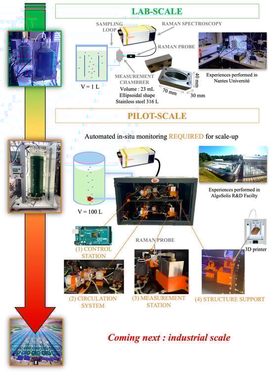 A large number of studies have shown the ability of confocal Raman spectroscopy to measure molecules of interest produced in microalgae, such as carbohydrates, pigments and lipids [,,,]. In some previous studies, authors have made original applications of Raman spectroscopy to identify microalgal species [,,] or as a multiparametric tool to monitor cell physiology during their production [,,,]. However, most of these studies have mainly focused on off-line Raman analysis at a laboratory-scale, confirmed by conventional analytical techniques such as mass spectrometry, nuclear magnetic resonance or chromatographic methods [,,,]. The possibility of increasing the accuracy of Raman spectroscopy to identify some algae species at the single-cell level was reported [,,,]. Nevertheless, the most of these studies are limited to laboratory use due to the necessity to deposit algae on a suitable surface. On the other hand, the literature reveals the online monitoring of microalgae by Raman probes immersed directly into the liquid cultures [,,,]. These very interesting investigations demonstrate the ability of Raman spectroscopy to monitor some specific molecules in situ. However, all these studies focused on a bench-scale proof of concept without testing the methods on a large-scale over a long period of time. Some issues such as biofilm formation on the probe, the biological contamination or light interference were also not properly addressed [,,,]. Technical details concerning the washing cycles or the automation of analysis have so far been neglected. The challenges that remain are therefore to automate such processes, adapt the technology to be economically viable under the field conditions of the production of microalgae and to scale it up to an industrial level. To achieve these objectives, the entire optical approach, including optical reading, statistical analysis and sampling, needs to be optimised for the widespread large-scale implementation of spectroscopy. One crucial aspect is to ensure that the materials used comply with industry standards and quality. The system should also preferably be shielded from light to enhance the adaptation of spectral analysis to the lighting conditions encountered in the microalgae industry. Additionally, it should be autonomous to ensure the reproducibility of the analyses and to minimize human intervention []. Considering the limitations of previous studies and the remaining challenges, this study proposes an automated Raman approach and its integration into a semi-industrial microalgal platform. By focusing on the specific requirements and complexities of large-scale implementation, this study aims to bridge the gap between bench-scale proof-of-concept and industrial problem solving, thereby contributing to the advancement of microalgae-based industries and enabling the more efficient monitoring of bioprocesses.