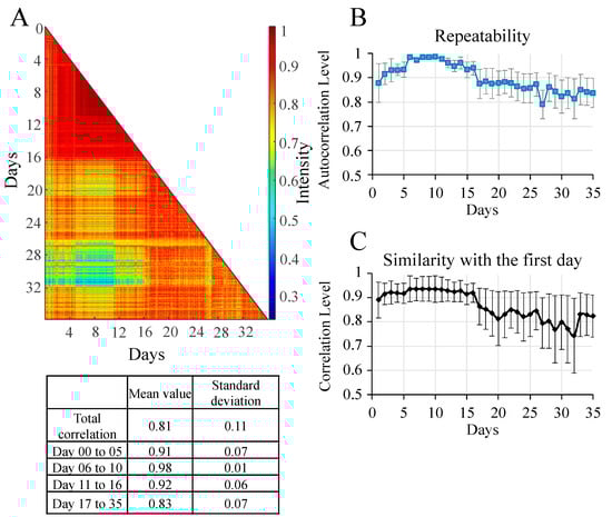 (A) 2D correlation map of all spectra with a correlation table covering the 36 days of culture in a 1-L airlift photobioreactor. The colour of each map point represents the level of correlation between two spectra, from red (highest correlation) to blue (lowest correlation). (B) Repeatability of spectra measured by the autocorrelation level between 50 spectra recorded in the same time window. (C) Similarity of the spectra to those of the first day assessed by calculating the correlation between them.