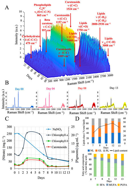 The 1793 spectra obtained over the 36 days of culture in the laboratory-scale 1-L photobioreactor revealed the kinetics of several molecules of interest (Figure 2A). The main bands are carbohydrates [δ (C-C-C)479cm−1]; phospholipids [C4N+, νs (O-C-C-N)865cm−1]; chlorophylls [δ (C-H3) 988cm−1]; carotenoids [ν (C-C)1157cm−1 and ν (C=C)1524cm−1]; and lipids [σ (C-H2)1444cm−1, ν (C=C)cis 1660cm−1, ν (C=O)1750cm−1, ν (C-H2)2850,2940cm−1, ν (C-H3)2885,2970cm−1 and νas (=C-H)3008cm−1] [,,,,] (Table S1). The intensity of the carotenoid bands increased during the first days, followed by a gradual decrease, and then an increase again in the final days. The median spectra of days 0, 4, 8 and 32 show this kinetics of the bands (Figure 2B). According to the literature, nitrogen deficiency triggers several physiological changes, including an increase in intracellular lipids, a gradual cessation of biomass growth, and a decrease in pigment concentrations []. The results of the physical-chemical analyses confirm the physiological kinetics as described in the literature (Figure 2C). The figure shows how pigment concentrations increased from day 0 and 6, while nitrate concentration decreased. Figure S3 presents the kinetics of culture density. The logarithmic values show an increase up until the 10th day, after which they stabilize.