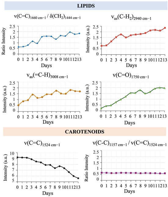 The kinetics of the culture were also monitored by conventional analyses conducted in parallel with Raman spectrum analyses (Figure 4C). The concentrations of chlorophyll a, chlorophyll b and carotenoids stabilised from day 3. When the culture was fed with N-free nutrient medium on day 8, the pigment concentration decreased due to this nitrogen limitation, which initiated the growth of cellular reserve lipids []. In this phase, intracellular lipids increased from 27.77 to 48.85 mg·L−1 from day 7 to day 12. The lipid composition of the cells also changed. These lipid fractions of microalgal cells contain neutral lipids (NL), glycolipids (GL) and phospholipids (PL). On the one hand, phospholipids and glycolipids, which are conducive to cell growth and major constituents of the intracellular membrane, decreased over the course of the experiment. On the other hand, neutral lipids (such as triacylglycerols, TAGs), also known as reserve lipids, were present in higher concentrations in the later days. Analysing the fatty acid composition, saturated fatty acids (SFAs) were the most abundant form of fatty acids (FAs). The proportion of polyunsaturated fatty acids (PUFAs) and monounsaturated fatty acids (MUFAs) increased in relation to saturated fatty acids (SFAs). The proportion of the unsaturated form in the cell increased by 22.8%. Figure S4 depicts the kinetic profile of culture density, demonstrating an increase in the absorbance values up to the 6th day. When an additional 50 L of BBM medium was introduced, the density decreased, subsequently increasing from the eighth day onwards. The results of the classical analyses on the Raman spectra were more clearly observed through the kinetic study of the intensity of the Raman bands. The ratio of the signal intensities of ν(C=C)1660cm−1 to δ(CH2)1444cm−1 is shown in Figure 5. This ratiometric method was used to estimate the content of SFA per fatty acid molecule without the influence of fluctuations and background noise []. The ratio of 1660 cm−1 to 1444 cm−1 suggests an increase in unsaturated bonds compared with saturated bonds over the whole culture time. Lipid bands at νas (C-H2) 2940 cm−1 and νas (=C-H) 3008 cm−1 confirm the increase of unsaturated fatty acids. Moreover, the band at 1750 cm−1 associated with TAGs also increased. Regarding carotenoids, the 1524 cm−1 band decreased its intensity over the culture production period. The ratio of 1157 cm−1 to 1524 cm−1 indicates that the variations of the ν(C-C) and ν(C=C) bonds remain proportional. These bands can be attributed to β-carotene, lutein or astaxanthin []. Although the total amount of carotenoids fluctuates, it is possible that the ratio between the carotenoid types did not change during the culture period.