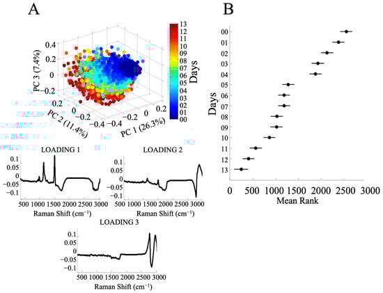(A) Three-dimensional representation of the principal component analysis (PCA) of spectra from a 14-day culture in a 100-L tubular airlift bioreactor (PC1 26.3%; PC2 11.4%; PC4 7.4%) and their three respective loadings. (B) Kruskal–Wallis one-way ANOVA test, based on PCA loading 1, representing the variance of the spectra over the 13 days.