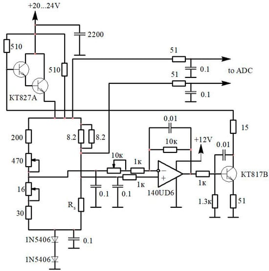 Electronic circuit of the developed constant-temperature hot-wire anemometer: ADC–analog-to-digital converter; KT827A–transistor; 1N5406–transistor; 140UD6–voltage amplifier; KT817B–transistor; Rs–resistance of the hot-wire anemometer sensor.