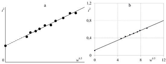 Linear dependence of i2 on w0.5 for the filament (sensitive element) of a constant-temperature hot-wire anemometer sensor (i—electric current strength, A; and w—airflow speed, m/s): (a) data from a monograph [1]; and (b) author’s data.