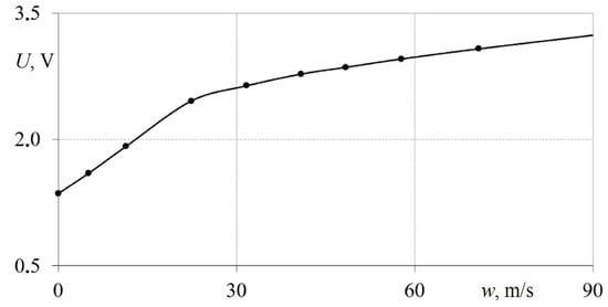 Thus, the airspeed was measured in 10–12 modes; in parallel, measurements were obtained with the developed hot-wire anemometer. As a result, calibration curves were calculated in the form of the dependence of the voltage at the output of the hot-wire anemometer U on the airspeed w (Figure 7). For all sensors being developed, similar measurements (calibrations) were carried out two to three times to confirm the results’ reproducibility.