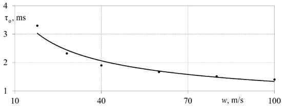 Figure 8 shows the dependence of the hot-wire anemometer time constant τo on the airflow velocity w for the developed measuring system (a hot-wire anemometer with a sensor). From Figure 8, it can be seen that the time constant τo of the measuring system ranged from 1.3 to 3.3 ms. In this case, τo decreased with an increased airflow speed [38]. This pattern was confirmed using classical data from other authors [1,36].