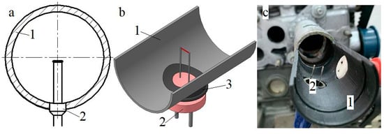 Diagram (a), three-dimensional model (b), and photograph (c) of installing a hot-wire anemometer sensor for measuring airflow velocity into a pipeline: 1—pipe; 2—hot-wire anemometer sensor; and 3—auxiliary spacer.
