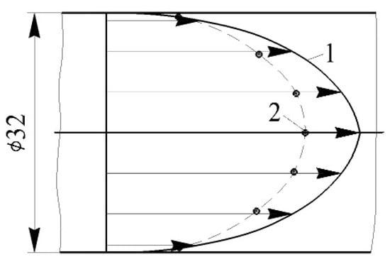 Comparison of velocity profiles in a long, straight pipe (inner diameter: 32 mm) at a distance of 50 calibres: 1—experimental data from [40]; 2—the author’s experimental data based on the proposed measuring system.