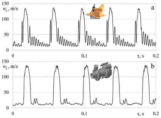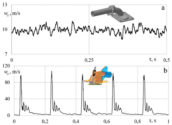 Dependences of changes in local airflow velocity wx in a piston engine’s intake system in time τ: (a) pulsating flow (a curvilinear pipeline with an operating poppet valve with a frequency of 25 Hz without any mechanical impact on the flow); (b) pulsating flow with an external influence (a curvilinear pipeline with a poppet valve operating at a frequency of 25 Hz with the action of turbocharger blades on the flow at a rotation speed of 46,000 rpm).