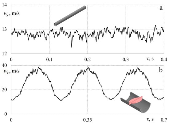 Dependences of changes in local airflow velocity wx in a long pipeline over time τ: (a) stationary flow with an average speed of w = 12.7 m/s (a straight pipeline); (b) pulsating flow with a frequency of 4.7 Hz (a straight pipeline with a rotating damper).