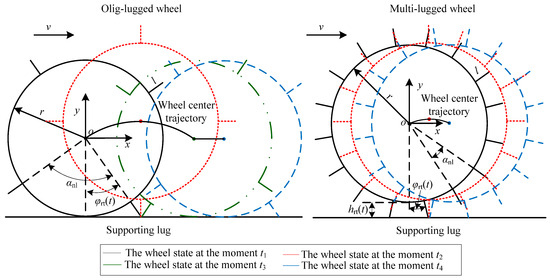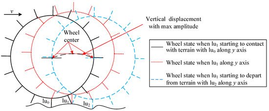 When a multi-lugged wheel moves on GT, some lugs will not be in contact with the surface. Thus, the vertical displacement of the multi-lugged wheel can also be expressed as Equation (41).