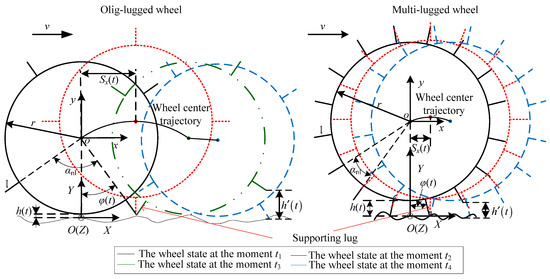 When a multi-lugged wheel traverses HT, since the wheel rim does not contact the terrain, is equal to and is bigger than . Thus, the h(t) calculated using Equation (24) is equal to h(t) calculated using Equation (11). Equation (24) can be regarded as a case of Equation (11). Whether the lugs on the wheel are olig or multi, the output displacement for a lugged wheel traversing HT can be expressed uniformly using Equation (22) with h(t) in Equation (11).